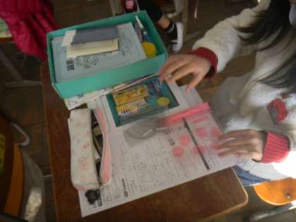 お道具箱の中は,よく使うはさみやのりは手前,めったに使わないクレパスは奥のほう,いらないものは捨てる…など,ひとりひとりが整理整頓の工夫を考えていました。教室のごみ箱や古紙を集めている箱が,子どもたちのお道具箱からでてきた必要のないものでいっぱいになりました…。きれいなお道具箱をいつまでも保ってほしいと思います。