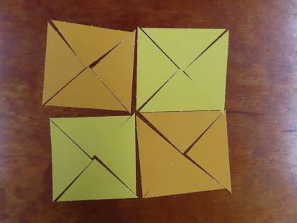 今日は,正方形,長方形,直角三角形を使って,もようづくりをしました。正方形を2つつなげると,長方形になったり,長方形2つを使うと正方形の形にもなることに気づいていました。例にならってもようづくりをしましたが,集中して黙々と学習に取り組んでいました。