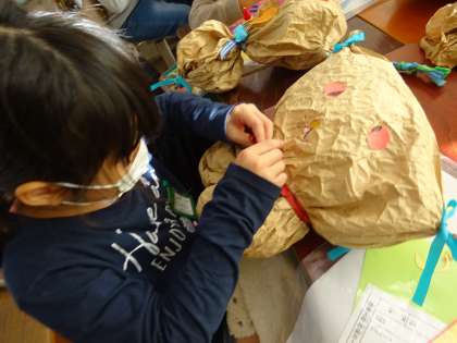 図画工作では紙をくしゃくしゃにして,ふくらませて ぎゅっとして,自分だけの友だちをつくりました。紙の素材をさわって十分に楽しみ,そこから「どんな友だちができるかな?」と子どもたちは考えています。向きをかえてみたり,しばり方をかえてみたりとたくさんの工夫をしました。さいごは,自分だけの友だちをぎゅーっとして,満面の笑みの子どもたちでした。