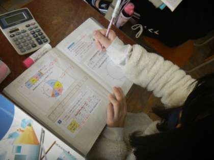 算数で「割合」の学習に取り組んだので,それを活用して帯グラフや円グラフをかく学習に取り組みました。目盛りが細かいので,「1,2,3…」と丁寧に数えていました。帯グラフや円グラフは,国語や社会の学習にもよく出てきます。算数で身に付けた力を他の学習でも活用してほしいと思います。
