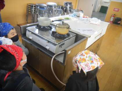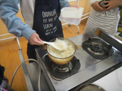お家では炊飯器を使ってご飯を炊くという人がほとんどだと思いますが,今回はお鍋でご飯を炊いていきます。透明のお鍋なので,お米がだんだん炊けていく様子を観察することができます。水がお鍋からあふれそうになると「大変!!」と声をあげていましたが,そこは我慢!最後までふたを開けないことがご飯をおいしく炊くためのポイントです。固いお米がふっくら炊き上がると,どのグループからも「おいしそう!!」という声が聞こえてきました。