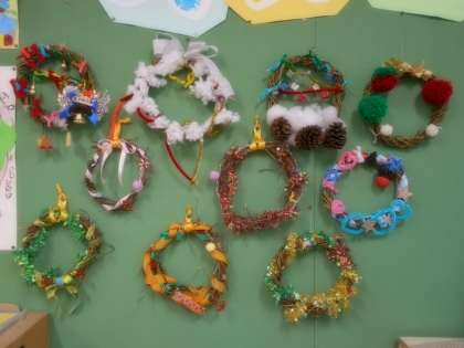 リボンやわた,木の実などを,思い思いに飾り付け,すてきなリースが完成しました。どの子も,楽しそうにつくっていました。