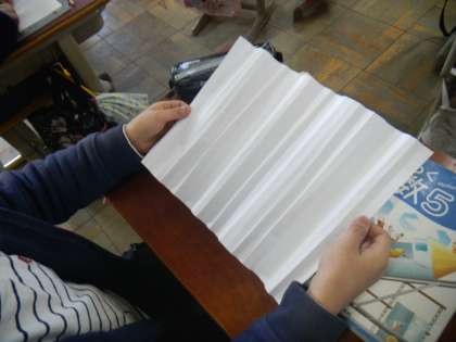 「紙を6回折って広げたとすると,折り目で分けられた長方形の数は何個になりますか。」という問題だったので,実際に紙を折ってみました…が,「先生,6回も折れません!」「折り目がありすぎて,数えられません!」と,子どもたち。ここで「表」の登場です。少ない回数から決まりを見つけることができたら,実際には折ることのできないような回数の場合も,答えを求めることができます。改めて「表」にまとめるよさを感じた学習でした。