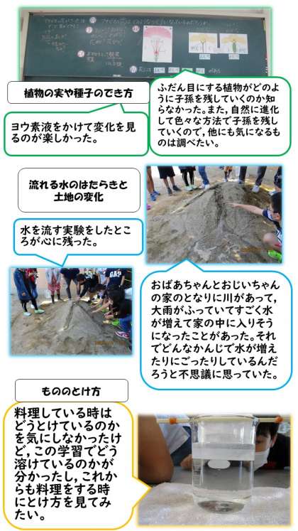 5年生の理科の学習では,とてもたくさんの実験を行ってきました。友だちと協力しながら学習できる5年生の子どもたち。2学期のふり返りを書いてもらうと様々な感想が見られました。3学期も一緒に学習できるのを楽しみしています。