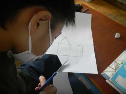 算数「角柱と円柱」の学習では,角柱の展開図作りに挑戦しました。底面をどこに描けばきちんと組み立つのか考えながら学習を進めました。切り取った展開図がきれいに組み立つと,「できた!!」とうれしそうにしていました。