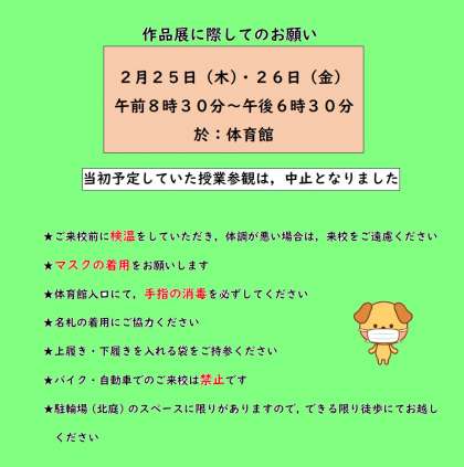 2月25日(木)・26日(金)の2日間,体育館にて作品展を行います。ご来校をお待ちしています。