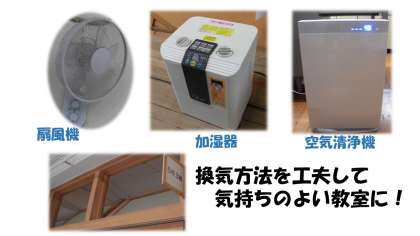 薬剤師の先生からは,換気扇や欄間窓で常時室内の空気と外気の入れ換えを行いながら,エアコンで寒さを緩和し,加湿器で空気の乾燥を防ぎ,扇風機で空気を循環させることができ,感染症対策に留意した良い教室環境が整ってきていることを褒めていただきました。