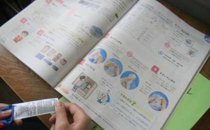 洋服のタグには,JIS(日本産業規格)が定めた取りあつかい表示がついています。「洗い方」「乾燥方法(干し方)」「アイロンのかけ方」などが図で表されています。自分の着ている洋服のタグと教科書に載っている一覧表を見比べながら,「この洋服はお湯で洗わないといけないんだな。」「乾燥機は使ってはいけない洋服だ!」と確認していました。学習したことが早速お家でも活かせそうです。