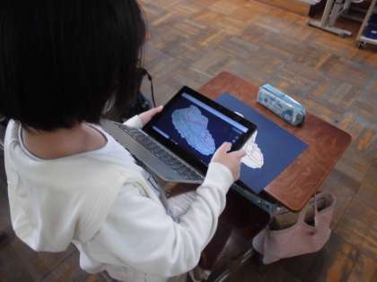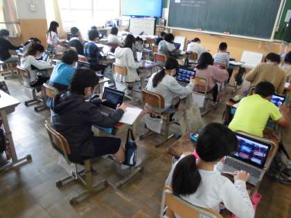 図画工作科の学習では,自分が描いたくつを鑑賞しました。今回は,ロイロノートを使って,自分の作品を写真に撮り,提出したものを全体で共有し,自分の席で鑑賞しました。クラスの友達の作品を拡大して細かい所を見ようとするなど,GIGA端末に慣れてきた様子が見られました。