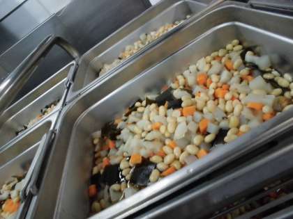 大豆は,スチコンで煮る前にゆでることで,やわらかくほくほくとした食感になります。