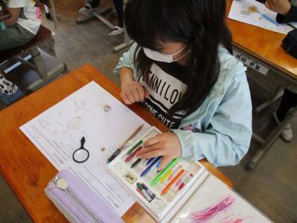 4年生ではツルレイシの種を観察しました。観察カードに絵を描き,見つけたことや気づいたことを書いていきました。たくさんの矢印を使って詳しく書いていく姿も見られ,小さな種でしたがよく観察していました。