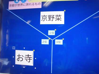 5年生になって初めての総合の学習を行いました。今日は,みんなで「京都が世界に誇れるもの」について考えました。今回は「Yチャート」を使って,順位がわかるようにまとめました。全員が提出したあと,画面共有することで,一人一人の考えを共有しました。「任天堂や京野菜が1位に多い」や「まいこさんもあるんや」などたくさんのことを発見する姿が見られました。これからも友達の考えをたくさん知り,学習を深めて欲しいなと思います。