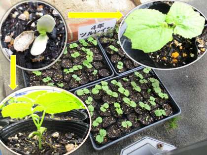 そして,ツルレイシは毎年発芽する数が少ないので今年も少ないかな,と不安に思っていましたが,なんとほとんどが発芽して大きくなっていました。実はこれは,4年生の担任が土の中の種を毎日見て,芽が出やすいように土を掘り起こしてくれていました。そのかいもあって4年生の子どもたちのようにスクスクと大きくなっているツルレイシです。