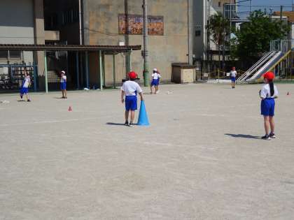 体育で「遠投」を学習しました。力いっぱい遠くへ投げることの楽しさに触れることや,短い助走で,投げ手と反対の足を踏み出し,自分の記録に挑戦することをねらいとしました。