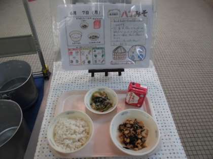 今日は,大豆献立「肉みそいため」が登場。