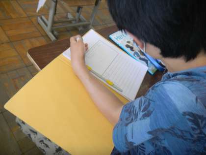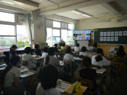 少しずつ英語も読めるようになってきた6年生。初めて知るスポーツの言い方でも,絵カードに書かれた文字を見ながら「こうかな?」と読むことができました。