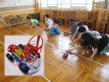 最後に乾電池で動くおもちゃを作りました。プロペラカーです。自分のプロペラカーを走らせて,とても大喜びの子どもたち。これも直列つなぎにしています。そして乾電池の向きを反対にすると後ろ向きに走ることも確かめました。