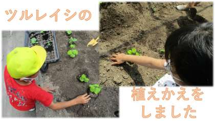ツルレイシがスクスクと成長しています。葉が5,6枚になったので,ポットから花壇に植えかえました。運動場の花壇にお引越しです。その前に一人ひとつずつ手にとり観察をしました。