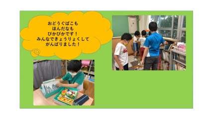 その後,筆箱,お道具箱,本棚・・・自分の身の回りやひまわり学級の片付いていないところを,きれいにしました。本棚の片付けでは,みんなが率先して本を片付ける姿がとても素敵でした。これからも,身の回りや教室をきれいにして,みんながいい気持ちで過ごせるようにしましょうね。