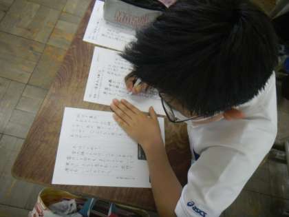 文字の大きさと配列に気を付けて,硬筆の学習に取り組みました。サインペンを使って字を書いていきます。鉛筆と違って間違えても消すことができないので,どの子も集中して取り組んでいました。平仮名や画数の少ない漢字はやや小さめに書くこと,文字の中心を行の中心にそろえ,曲がらないように書くことを意識してがんばりました。