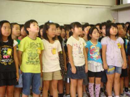 次に全校合唱「すてきな友達」の練習です。今日,はじめて全校で声を合わせます。