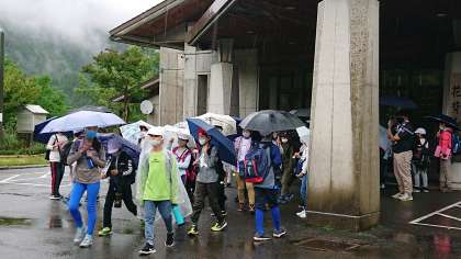 野外炊事場へ移動します。雨が降っているので傘をさしての移動です。