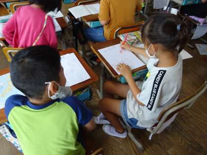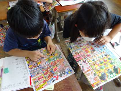 社会科「商店のはたらき」では,スーパーマーケットで働いている人の工夫について学習しました。そこから,「スーパーマーケットで売っている品物は,いったいどこから来ているのだろう?」と疑問を持ち,調べていくことにしました。ちらしをみて,産地を調べる方法を知り,ペアで意欲的に取り組む子どもたち。その後,白地図にまとめていると,「スーパーマーケットで売っている品物は,日本中の色々な場所から来てるのか!」と,たくさんの気づきがあったようです。