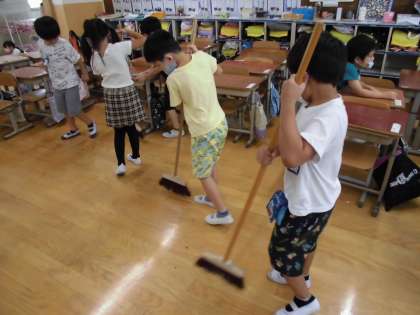 2学期になり教室の床が見違えるように美しくなりました。毎日きもちよく学習しています。皆が毎日学習している教室を美しく保とうと,毎日力を合わせて掃除をがんばっています。身長よりも高いほうきを一生懸命動かしてごみを掃いています。机は重いので,安全に気を付けて二人で運んでいます。美しくなった床は乾いたぞうきんでふいています。すみずみまで美しくするのは難しいです。そうじも少しずつ上手にできるようになりたいな,と思っています。