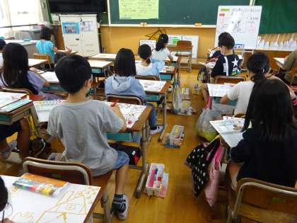 図画工作科「ことばから形・色」では,物語から想像を広げ,表したいことを工夫して絵をかきました。同じ物語でも,それぞれが描く作品はまったくちがい,面白さを感じる作品ばかりです。自由に,そして楽しそうに作品をつくる子どもたちの姿が印象的でした。