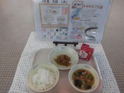 今日は,九州の郷土料理「だご汁」と熊本県の特産品「トマト」をかけ合わせた,「トマトだご汁」が登場しました。
