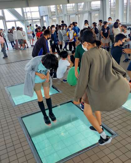 ガラス張りの床に驚いています。