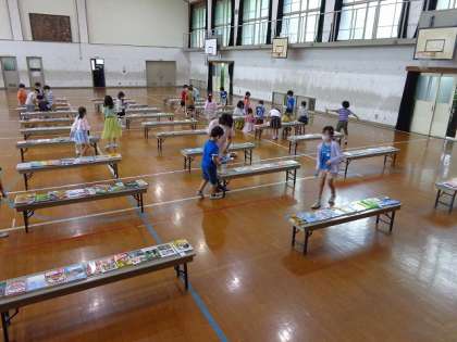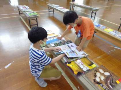 用意された本の数は,なんと400冊超!この中から,読みたい本を一人1冊決めます。まるで,小さな図書館に変身したような体育館で,子どもたちは目を輝かせながら,夢中で選書していました。