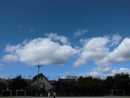 今,国語で「くじらぐも」の学習をしています。今日,運動場で運動会の練習をしていました。「先生,見て見てくじらぐもや〜」「ほんまや」と子どもたち。私たちが見るとただの雲。もう一度よくみてみるとくじらに見える気がしてきました。子どもたちの発想はとっても豊かです。