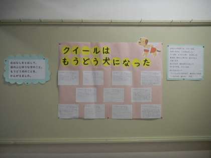 2年生は,「クイールは盲導犬になった」のお話を通して,視覚障がいのある人がいることを知り,ともに仲良く生活することの大切さについて考えました。目の見えない人たちのために一生懸命がんばるクイールを応援する感想がたくさん集まりました。