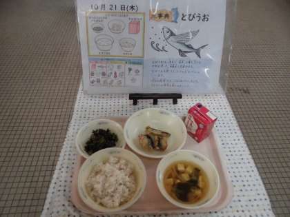 今日はお魚献立「とびうおのこはくあげ」が登場しました。