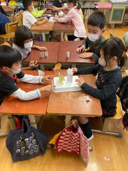 2年生は,中間休みになると,運動場へ行ってドッチボールや鉄棒をして遊んでいます。感染予防のため,昼休みは教室で過ごしています。毎日,粘土をしたり自由帳に絵を描いたりして遊んでいるので,新しい遊びを紹介しました。トントン相撲です。手作りの力士を土俵に上げて,相撲を楽しみました。