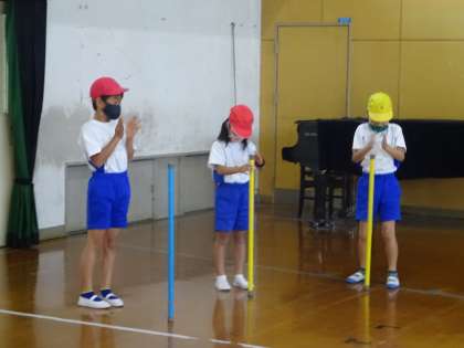 体育科では,「フラフープ」「ぼう」「ボール」を使って,用具遊びを行いました。まずは,1人でできる遊びを考えます。ぼうが倒れるまでに何回手が叩けるかや,フラフープのいろいろな回し方などを楽しんでいました。そこから,2人3人と活動の人数を増やしていき,新しい遊びを考えていきます。1つの用具にも関わらず,様々な遊びを考えて楽しむ子どもたちの姿には,驚かされました。次は,また別の用具で遊びます。楽しみですね。