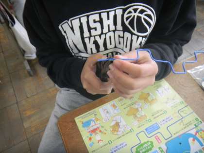 初めはペンチを使って針金を曲げる学習です。力の入れ方が難しかったようで,なかなか自分の思っている方向に針金が曲がらず苦戦していましたが,きれいに曲げられるようになりました。