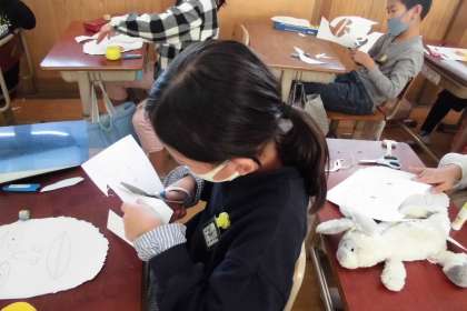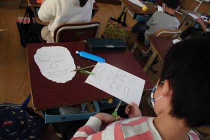 今日は,それを見ながら,紙にパーツをかき出し,貼り合わせていきました。目や眉毛,口など,形や大きさを考え,じっくりパーツを作成していました。そして,作ったパーツをどこに置くか,たくさん試しながら作ることで思いの詰まった顔が出来上がりつつあります。この後,髪の毛や手を加えていきます。どんな仕上がりになるのか,楽しみです。