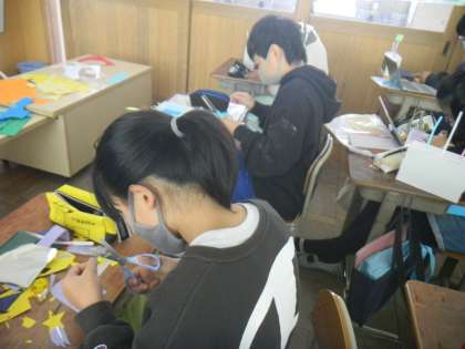 図工では「くるくるクランク」の学習に取り組んでいます。クランクの仕組みを利用すると,箱から飛び出しているストローが上下に動きます。その動きを活かして,そのストローに何を作って貼り付けるかが学習のポイントです。