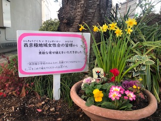 西京極地域女性会の皆様より,素敵な寄せ植えをいただきました。「西京極小学校の子どもたちが,毎日笑顔ですごせるように」ときれいなお花をたくさん植えてくださいました。地域の方が,子どもたちをいろいろなところで支えてくださっています。ありがとうございます。