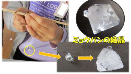 今回は,モールを使った簡単な食塩の結晶作りとミョウバンの種結晶を割りばしにつける作業をしました。それぞれの水溶液に数日間つけておくと…ちゃんとできていました!