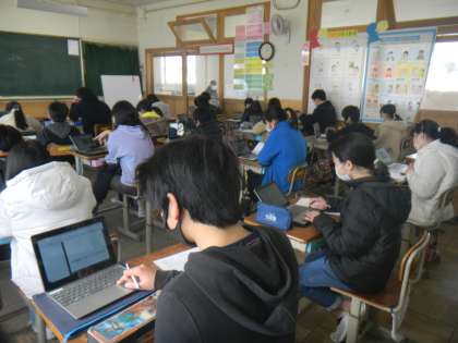 今年は残念ながら体育館での作品展が実施できなかったので,GiGA端末を使って鑑賞を行いました。実際の作品ではなく写真での鑑賞になってしまいましたが,写真をズームして見るなど,GIGA端末ならではの鑑賞をする様子も見られました。他の学年の作品を見て,よいところやこれから真似したいところをたくさん見つけていました。