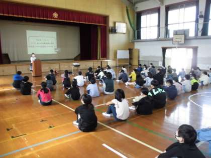 今回は6年生のみが体育館に入り,その他の学年は,昨年度に引き続きテレビ会議(リモート)で行いました。