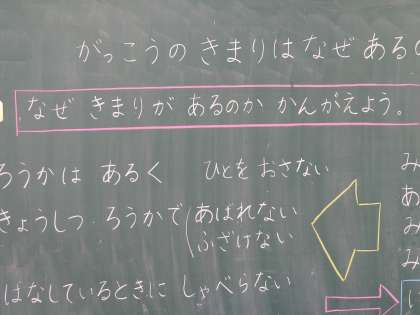 なぜ,そのきまりがあるのかについての話し合いでは,「みんながけがをしないため」「みんなをまもるため」「みんなにやさしくするため」など,安全面や,人を大切にするとう人権の観点などから,よい意見がたくさん出ました。