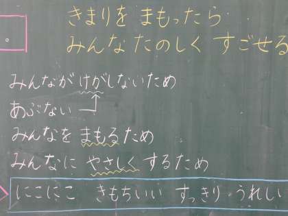 意味をきちんと理解して,みんながきまりを守ると,「にこにこ,きもちいい,うれしい」という,まとめになり,今後もきまりを守り,安全にみんなで楽しくすごしていこうという思いをもつことができた1年生でした。