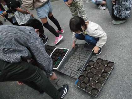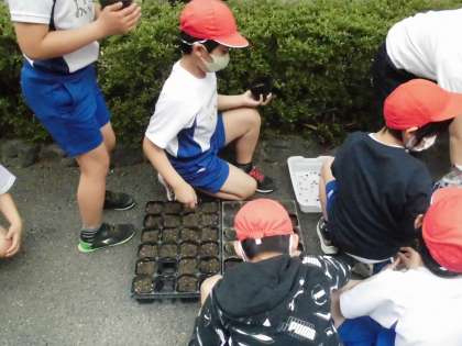 理科では,ツルレイシの種の観察をした後,種まきをしました。