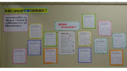 6年生はともだちの日の学習で,「学校のきまり」について学習しました。西京極小学校の「みんなのきまり」から,それぞれが大事だと思うきまりを1つ選んで,なぜこのきまりが大事なのか考えました。