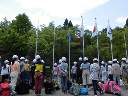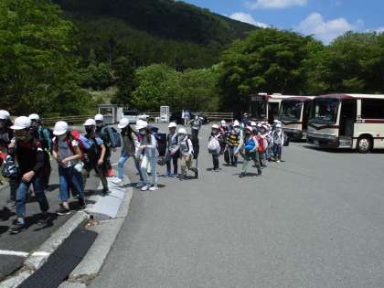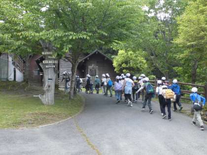 入所式の後,所内散策をしました。山の家の自然に,子どもたちは目を輝かせています。
