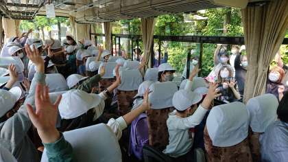 外の景色を見て子どもたちは,歓声をあげています。
